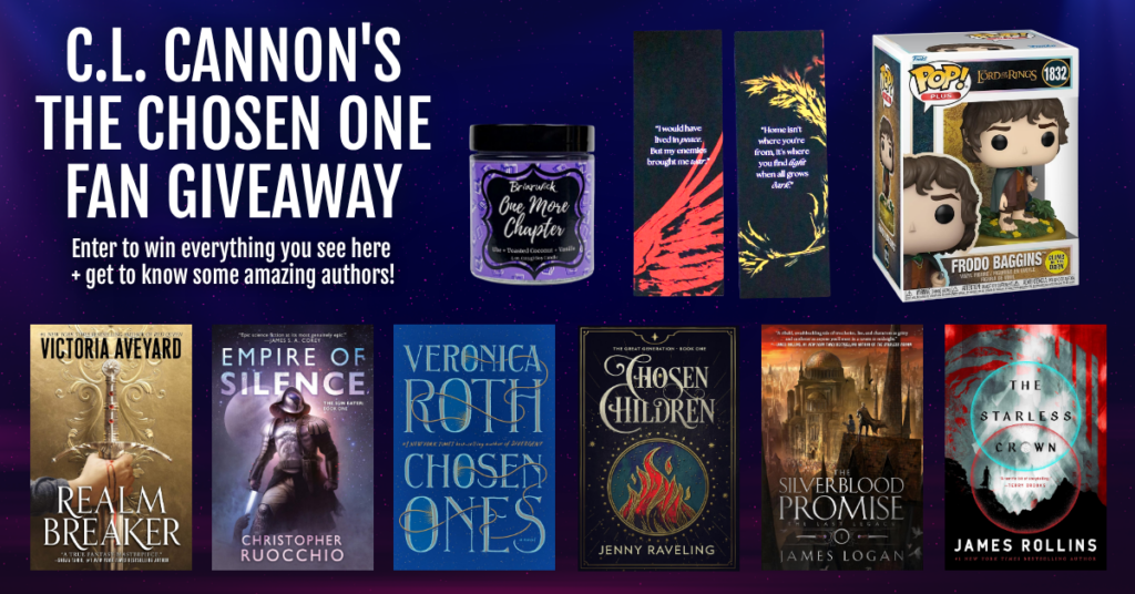 Print copies of Realm Breaker by Victoria Aveyard, Empire of Silence by Christopher Ruocchio, Chosen Ones by Veronica Roth, Chosen Children by Jenny Raveling, The Silverblood Promise by James Logan, & The Starless Crown by James Rollins + A Frodo Baggins Funko Pop, One More Chapter candle, and Red Rising Bookmark set!